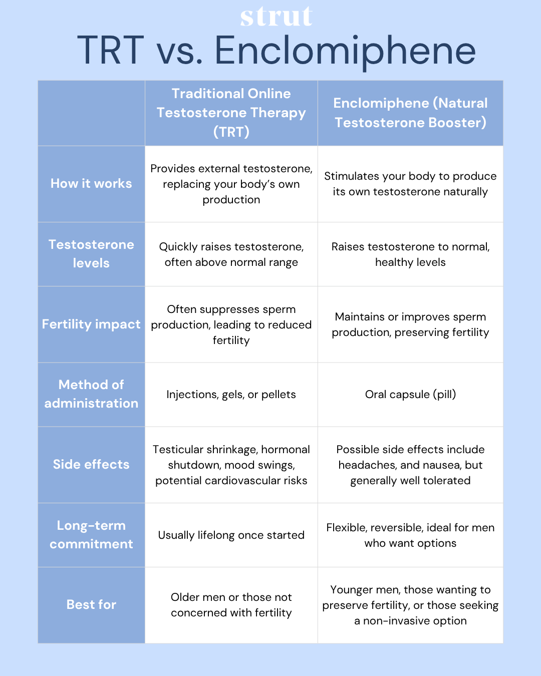 This means enclomiphene can boost your testosterone and preserve your fertility at the same time, a balance traditional online testosterone therapy doesn't offer.