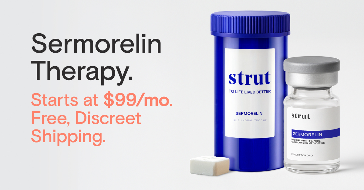 At Strut Health, we offer both sermorelin options, and you'll work with a doctor to determine the best choice for you. If you're a good candidate, your sermorelin is delivered right to your door.